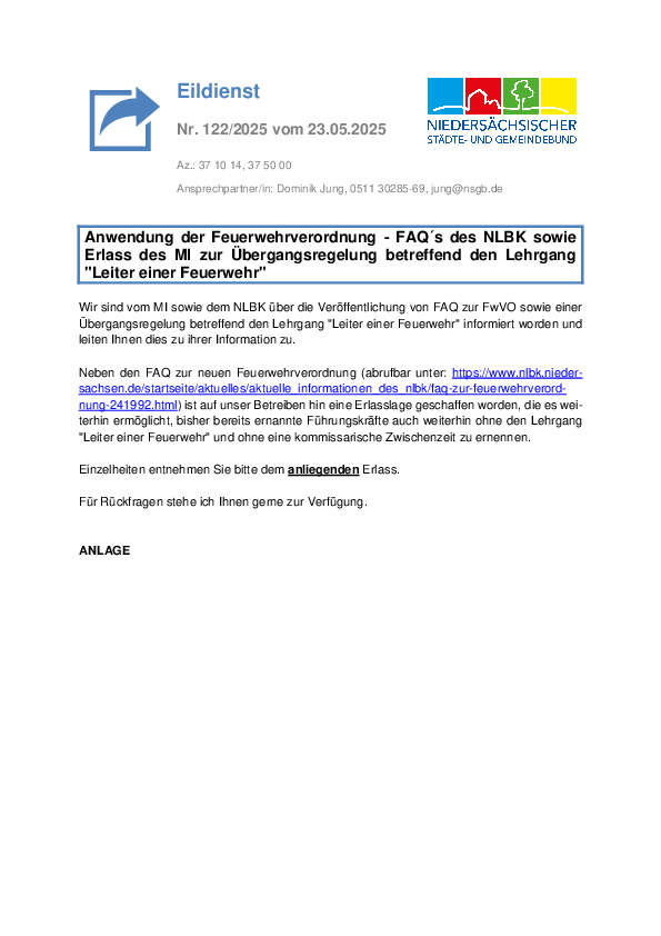 am 23. Mai 2025 hat die Abteilung 7 des Niedersächsischen Ministeriums für Inneres, Sport und Digitalisierung eine Übergangsregelung zum Umgang mit dem Lehrgang „Leiter einer Feuerwehr“ für die ordnungsgemäße Übertragung einer Regelfunktion für ehrenamtliche Führungskräfte nach §§ 20-22 des NBrandSchG veröffentlicht.