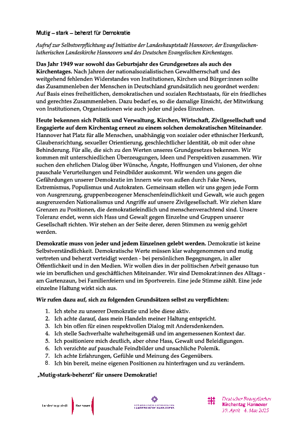 Die Stadt Hannover, der Kirchentag e.V. sowie die Evangelisch-lutherische Landeskirche Hannovers hat am Freitag, den 2. Mai 2025, im Vorfeld eines großen Konzerts auf dem Platz der Menschenrechte in Hannover, eine Erklärung zur Stärkung der Demokratie verlesen.