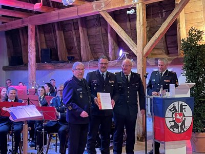 Von dem Vizepräsidenten des Deutschen Feuerwehrverbandes, Dr. Frank Kämmer, und dem Bundesstabführer Thorsten Zywietz, wurde den Jubilaren eine Dankesurkunde und der „Berliner Feuerbär“ überreicht.