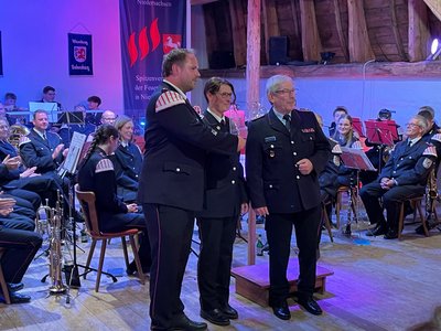 Nach einem weiteren Musikstück bat Dirigent Pieter Sikkema den Präsidenten des Landesfeuerwehrverbandes Niedersachsen, Kamerad Olaf Kapke und den Landesstabführer Bodo Wartenberg an das Rednerpult. Kapke dankte den Musikerinnen und Musikern für ihr herausragendes Engagement sowohl im Musik- als auch im Einsatzdienst ihrer Feuerwehr, er verlas den Text der Ehrenurkunde des Landesfeuerwehrverbandes und übereichte die Urkunde an den Musikzugführer Benedikt Bornemann. Landesstabführer Bodo Wartenberg leitete zum Höhepunkt des Festaktes, der Verleihung der „Pro-Musica-Plakette“, über. Er knüpfte an die Worte der Bürgermeisterin an und berichtete zum Entstehungsjahr (1968) und Initiator (damaliger Bundespräsident Heinrich Lübke) dieser hohen Auszeichnung. Auch er verlas den Text der Urkunde, die er anschließend in Vertretung für den Bundespräsidenten Frank-Walter Steinmeier an Musikzugführer Benedikt Bornemann und Dirigent Pieter Sikkema überreichte. Mit „standing ovations“ und langanhaltendem Applaus nahmen die Gäste des Festaktes Anteil an der Ehrung des Musikzuges Fuhrberg.
